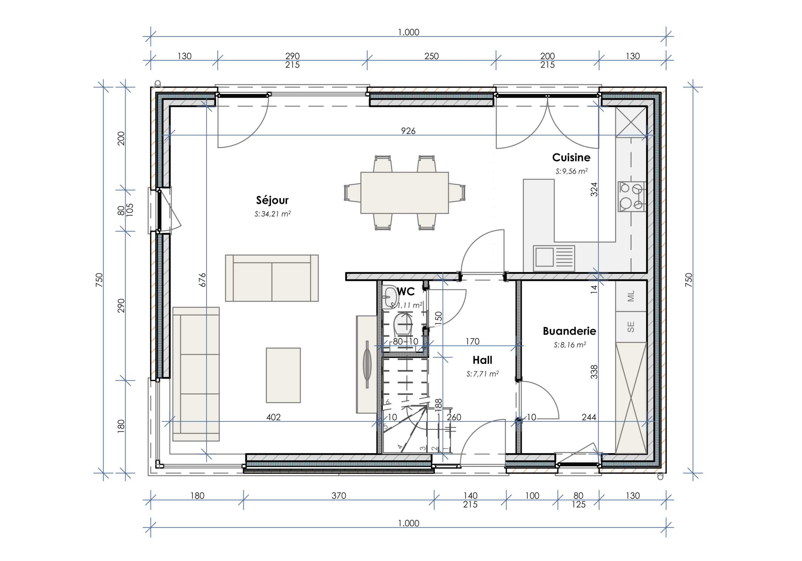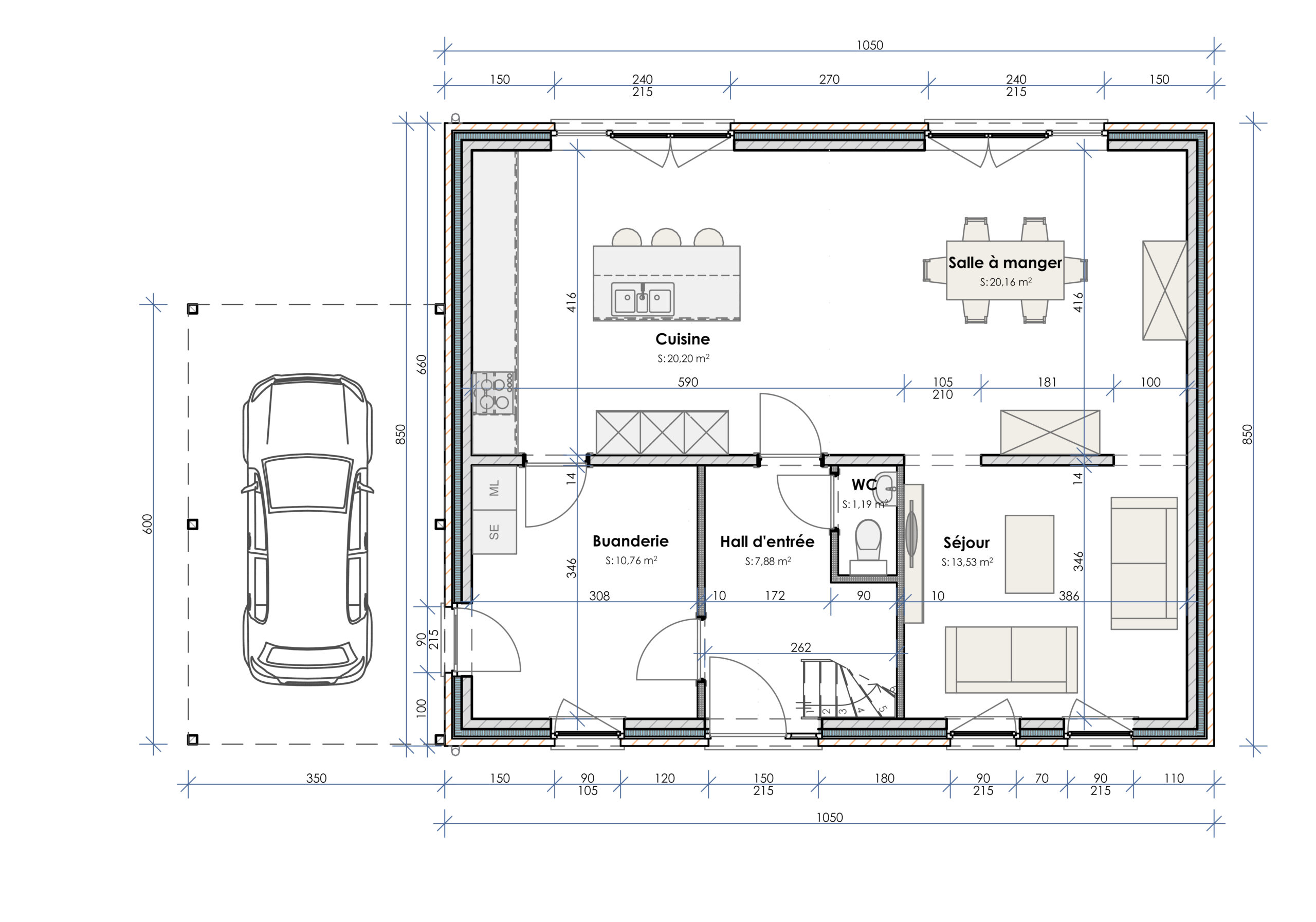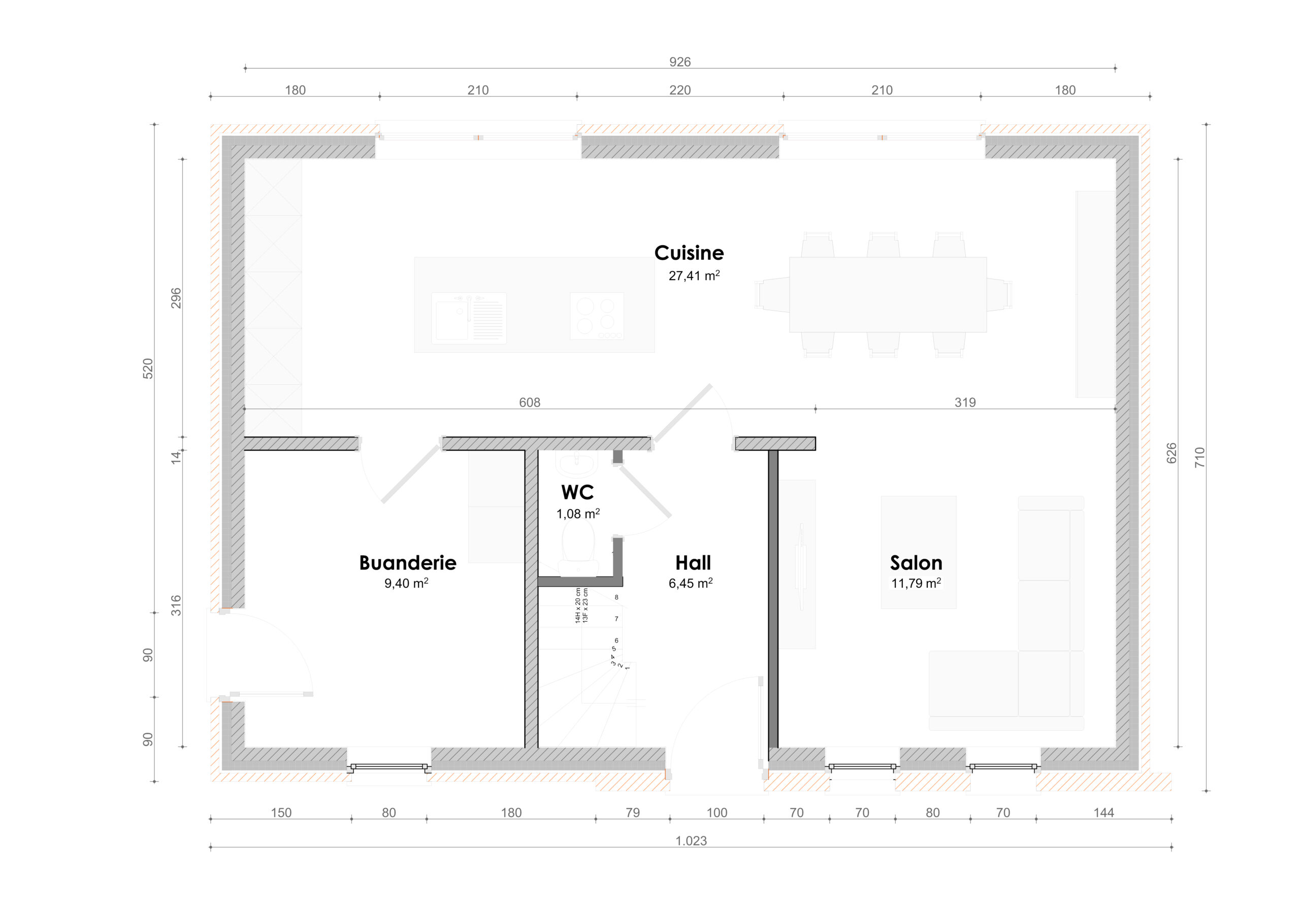 Cette maison offre un bel espace de vie ouvert composé d’une cuisine avec îlot central, d’une salle à manger conviviale et d’un salon lumineux. Le rez-de-chaussée comprend également un hall d’entrée, un WC indépendant et une buanderie fonctionnelle avec accès extérieur.