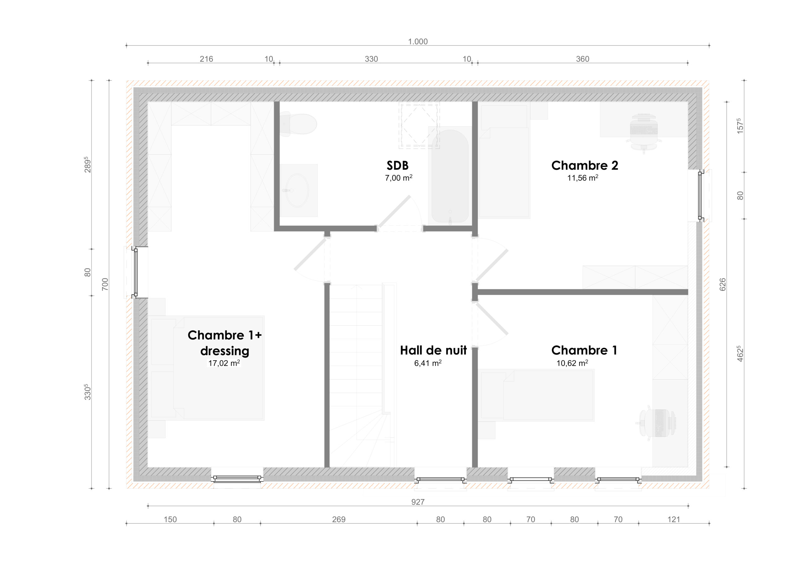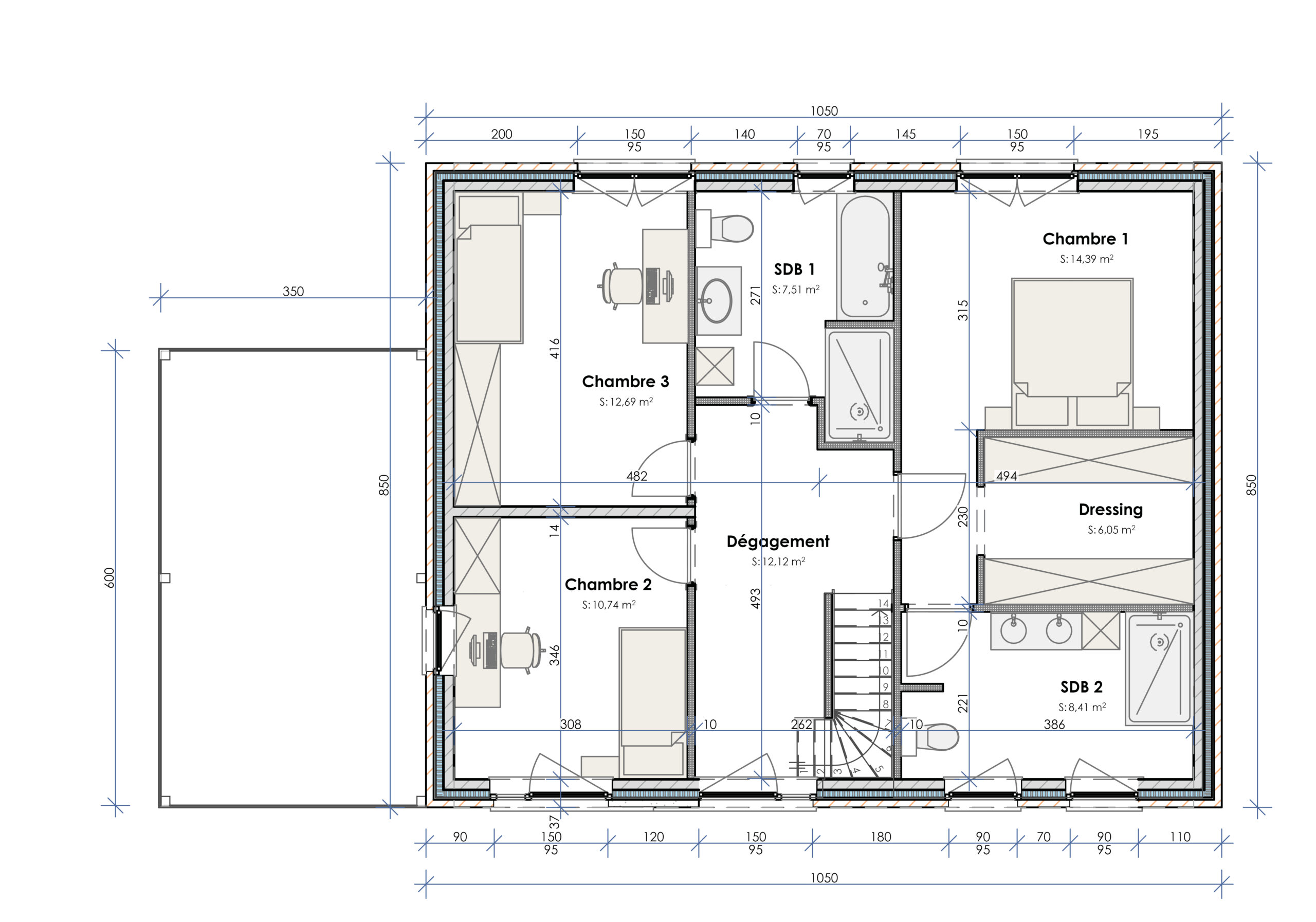 À l’étage, l’espace nuit se compose de trois chambres, dont une suite parentale avec dressing, ainsi que de deux salles de bains, le tout organisé autour d’un dégagement central.