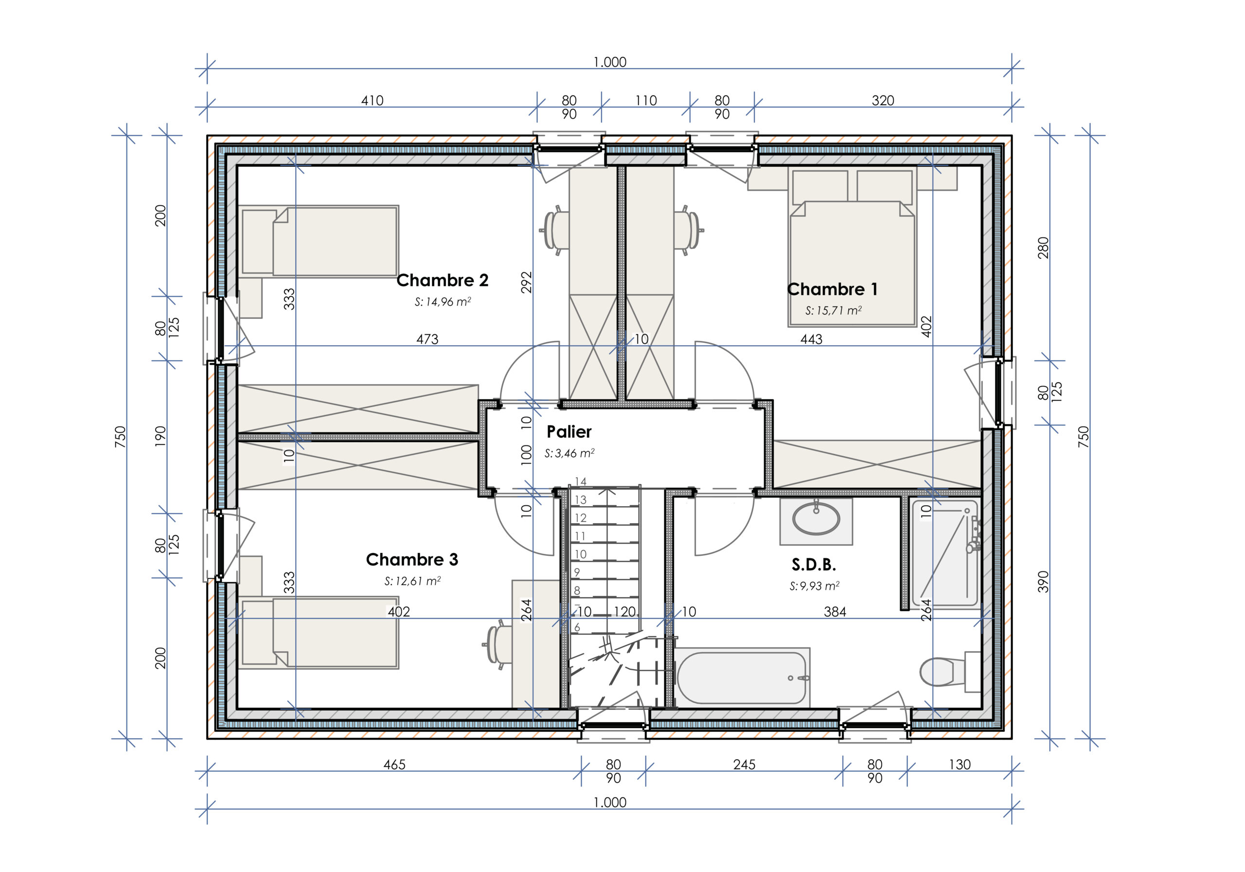À l’étage, l’espace nuit se compose de trois chambres confortables et d’une spacieuse salle de bains, le tout organisé autour d’un palier central assurant une circulation fluide.